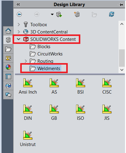 Để truy cập vào tất cả các cấu hình tiêu chuẩn có sẵn trong SOLIDWORKS, hãy chuyển đến thanh SOLIDWORKS Task pane và chọn thẻ Design Liblary. Từ đó mở rộng thư mục SOLIDWORKS Content> Weldments như dưới đây và liệt kê tất cả các tiêu chuẩn sẵn có để tải xuống.